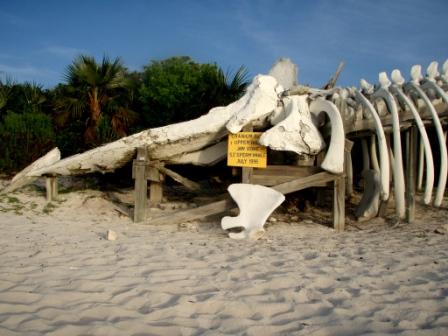 We really love it here. It’s so beautiful and the water 17 feet below our keel is so clear. They have really done a great job with the park. The park is the first land and sea park in the world and it covers 176 square miles. On Warderick Wells, there are 4 miles of marked trails. The trials are really nice, very well marked and easy to follow. You can tell they have put a lot of work and pride into the clearing, marking and maintaining of them. At the front of the park is a skeleton of a 52 foot sperm whale that was killed by eating plastic. We know there is a big debate going on right now in the States about plastic drinking bottles. You would not believe all the plastic bottles we see washed up on the beaches. When you see a magnificent creature like this, lost to a water-bottle, it really drives the point home that we need to make a change.