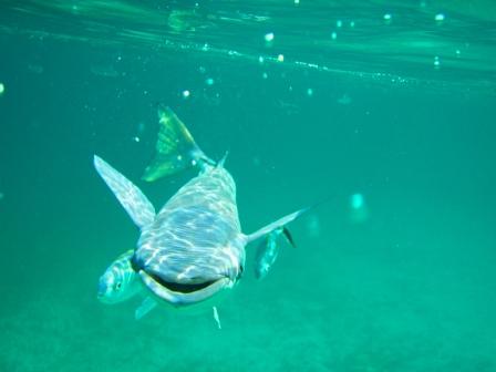 Because the current here is so strong, and to protect the bottom, all boats have to be on a mooring ball. That’s fine with us. It makes life a little easier. We have some great fish under our boat, some very large Horse Eyed Jacks and one crazy Sharksucker. Sharksuckers have this unique flat suction cup on top of their heads that allows them to attach themselves to bigger fish. He enjoyed the shade under our boat and the occasional Cheerio. The rays were easy to see in the clear water.