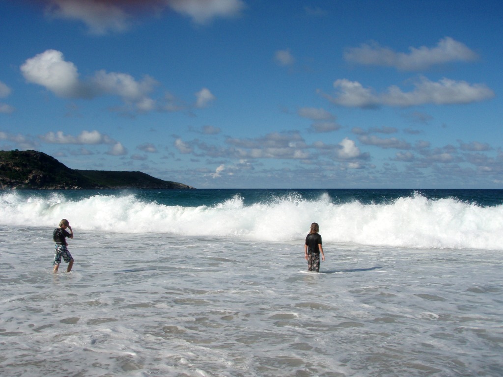 We had a great lunch and afterwards headed toward the sand dunes on the windward side of the island. The owner’s of the restaurant let their 6 year old son, Miguel, go with us. Interesting. Cruisers are so paranoid of Venezuela, but these people trusted us, who don’t speak Spanish, to take their 6 year old son, (who doesn’t speak English) in a dinghy, around the island, up over the dunes, and watch out for him as he and our kids played in the surf. Imagine allowing your child to do that.